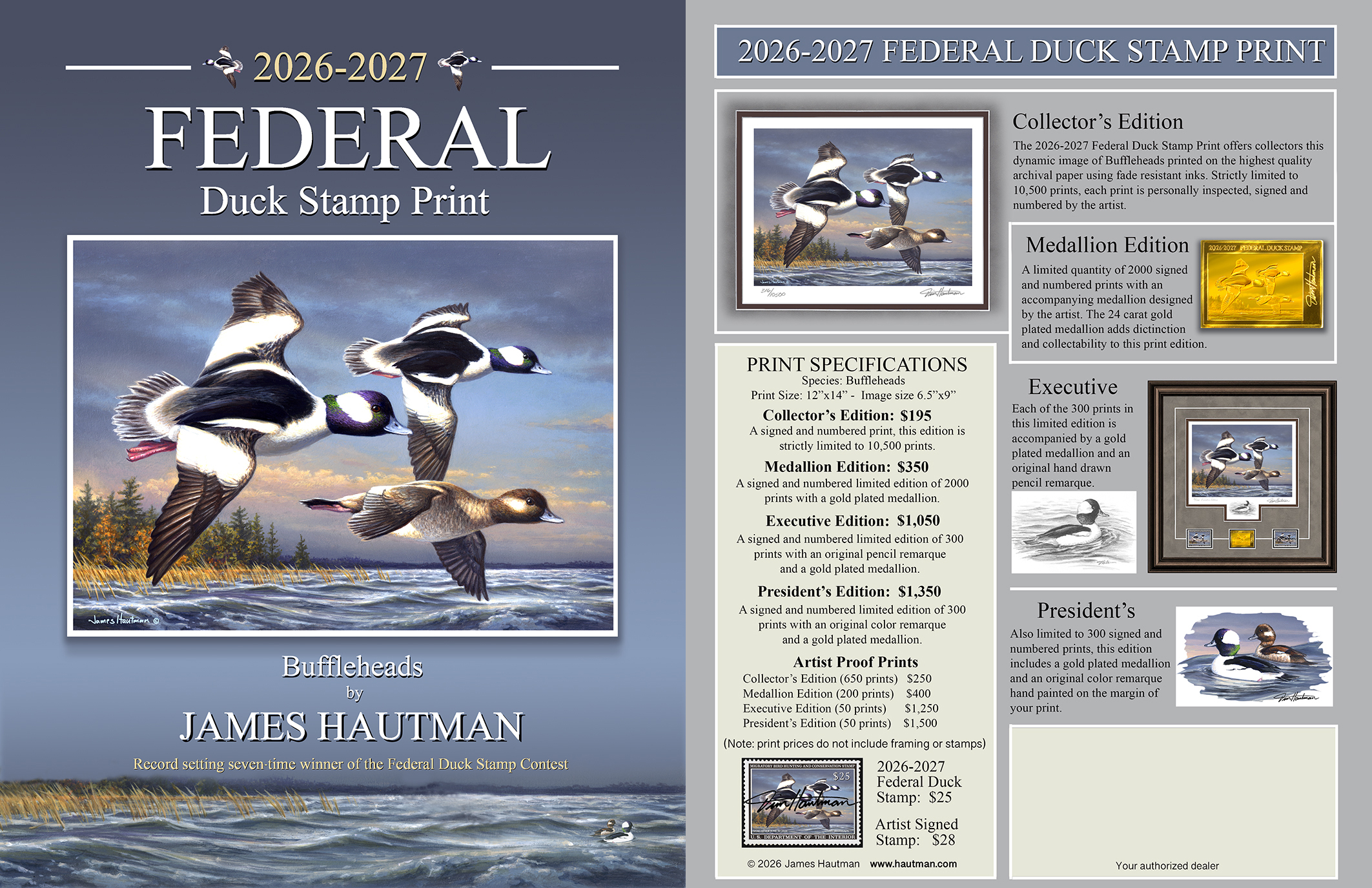 September 2025 Jim has won his new record 7th Federal Duck Stamp competition. Limited edition prints of "Buffleheads" will be available soon.